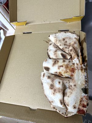 蓋を開けてみたら、箱の縁にピザが裏返しに
