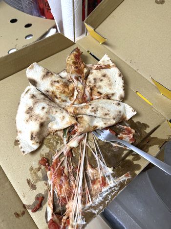 なんとか、ピザを箱から引き離して、ひっくり返そう