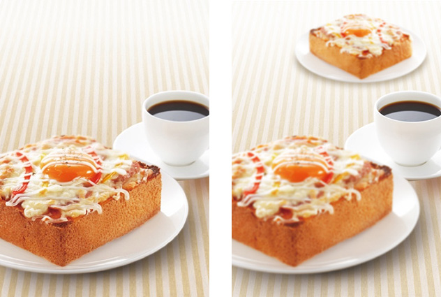コーヒーは以前撮影したものの中から、角度の合うものを探し、明るさや影の位置を調整し、合成しました。後ろの、少しぼやけたピザトーストは手前のものと同一の写真です。左右を反転してあります。左上のパブリカとチーズは、やはり有りものから探しました。