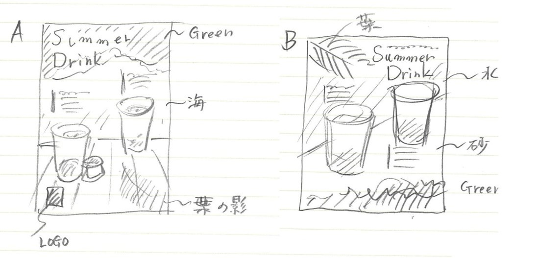 最終的に今回は、やっぱり、夏のイメージ+水かな、ということで、簡単な手書きサムネールをいくつか描いて、その中から、良さそうなものを二つ選びました。