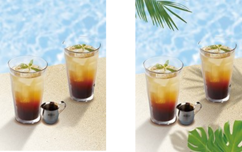 左は、ただ飲み物を載せただけ。右は簡単に影をつけたもの。