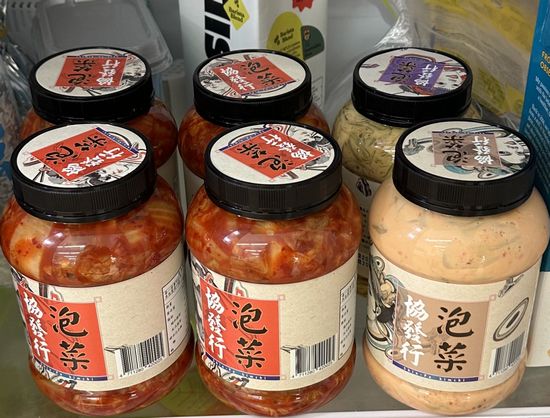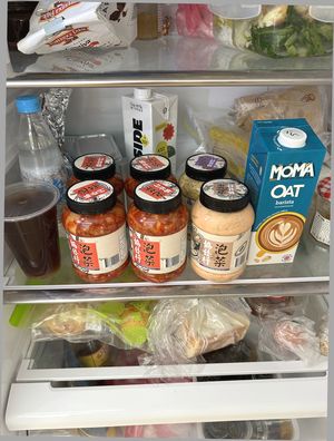 会社の冷蔵庫に大きなキムチが6瓶入っています。