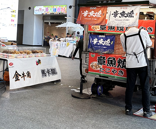 クロワッサン、マカロン、たこ焼き、同時売り。