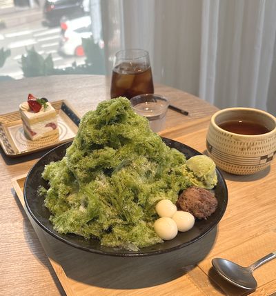 抹茶白玉あずきカキ氷の向こうにイチゴショートケーキ