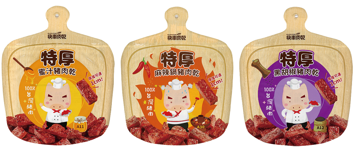 Wei Chuan:對於設計內容,客戶提出了如下要求:「首先,這款產品是主力商品,所以希望可以用不同以往的方式來呈現,包裝袋的形狀上也要捨棄一般常見的四角形,改成比較特殊的形狀。不過,臺灣民眾對『快車肉乾』的小豬吉祥物已經很熟悉,我們希望可以直接沿用。」除此之外,由於採用特殊印刷的印刷方式,而非一般的紙張印刷。因為跟一般的印刷不一樣,所以在檔案製作上也有很多限制條件。